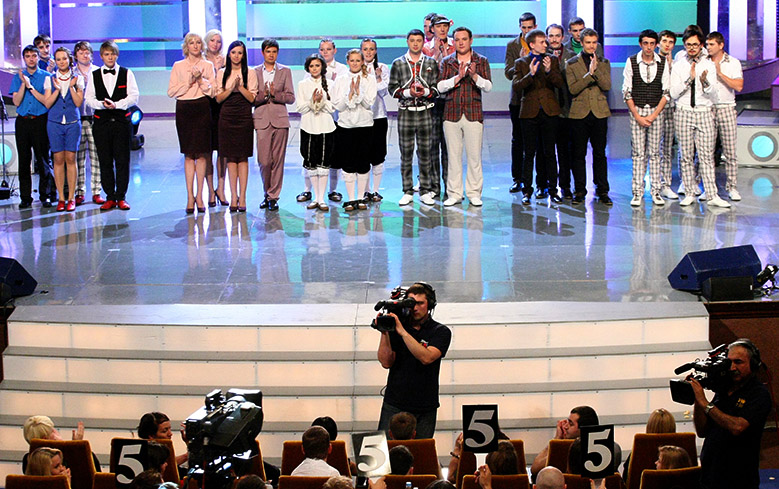 Сборная Физтеха. Презентация проекта общественного телевидения. Герра (капитан команды) представляет презентацию нового телевидения: здесь и варианты логотипов и сетка вещания с сериалами, политическими программами, мультиками и спортом. Всё решено в привычном для Физтеха интерактиве с устными комментариями и видеороликами, их иллюстрирующими. Рвут зал детским мультиком со специальными вставками из "Каникул в Мексике" и аналитической передачей о спорте. Ай, хороши!