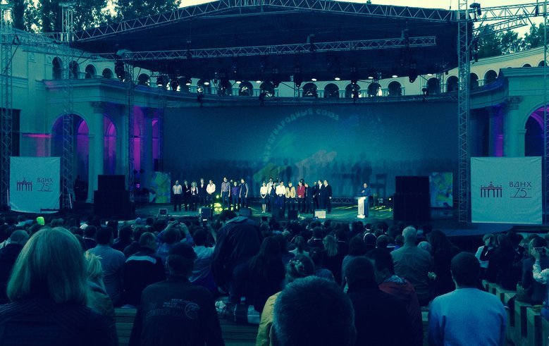 Автор этих строк прогулялся по обновлённому парку примерно за час до мероприятия. Действительно, есть на что посмотреть – помимо всем известных фонтанов и павильонов это дом-перевёртыш, множество новых кафе и аттракционов. В павильонах братских стран работают магазины, где можно купить армянский арцах или кыргызский напиток шоро. У центрального входа сбоку рокеры громко играют Цоя, неподалёку два парня на заниженных «Ладах» крутят рэп. Рэп такой, что хотелось вернуться и дослушать Цоя. Радостно визжат люди на аттракционах, озираясь по сторонам, прогуливаются туристы с фотоаппаратами и семьи с детьми. Всюду велосипеды, ролики и… автобус, готовый отвезти вас в любую точку ВДНХ. Платно или нет – я не уточнял, я пешочком.