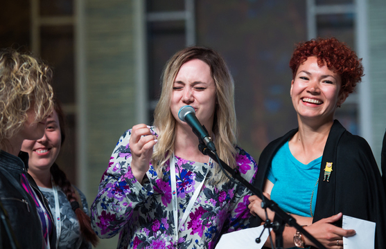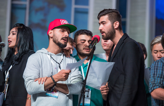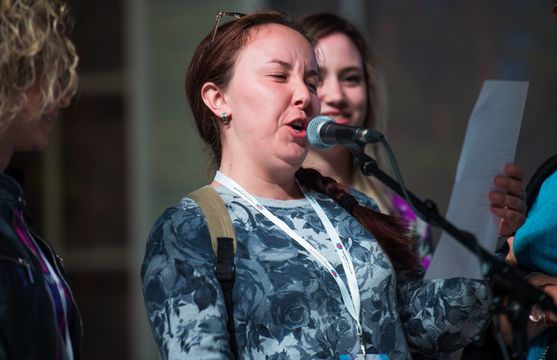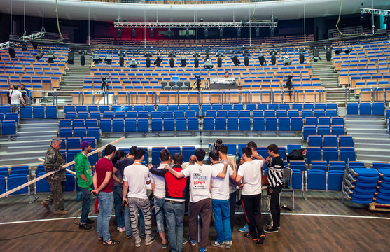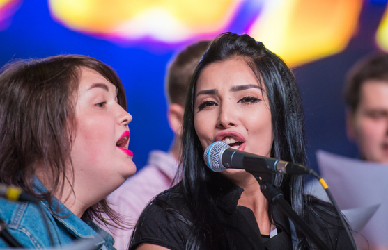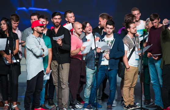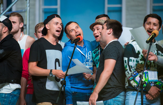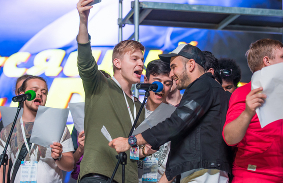 Ну а незадолго до ночника состоялась репетиция финальной песни – редакторы выбрали 49 вокалистов, которые споют «Ветер перемен». Запись песни, кстати, состоится сегодня после сбора программы. Ищем знакомые лица: