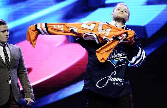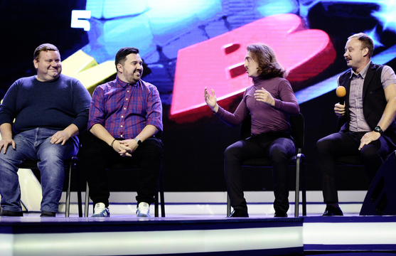 19.16 Огромный ледовый стадион забит полностью. На сцене появляются редакторы Высшей лиги – Дмитрий Колчин и Дмитрий Шпеньков – поприветствовать публику и рассказать о правилах поведения во время телевизионной съемки.