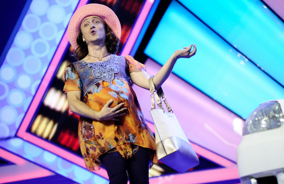 21.04 Посреди дороги к ним подсаживается... Дорохов в образе беременной женщины. Денис пополняет свое портфолио женских образов.