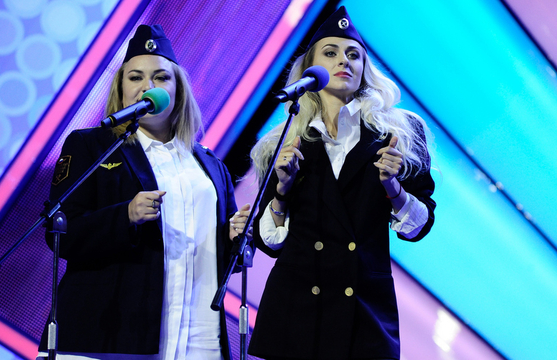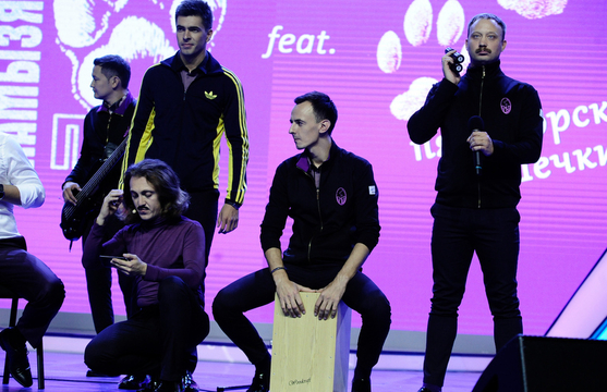 19,47 Вас приветствуют создатели таких хитов, как «Друг в беде не бросит, в Рио флаг выносит» – «Союз» на сцене, господа.