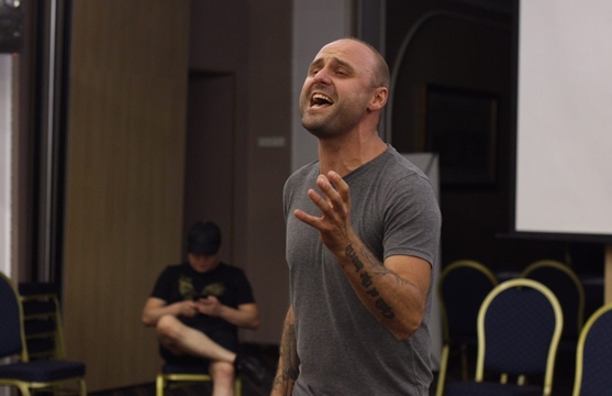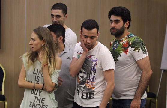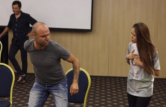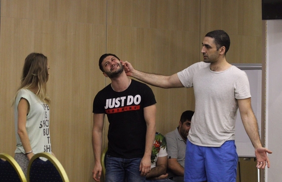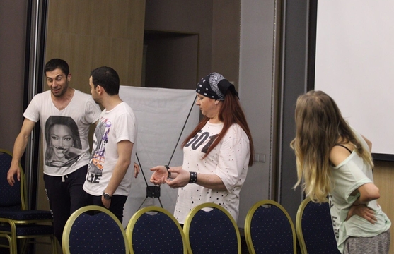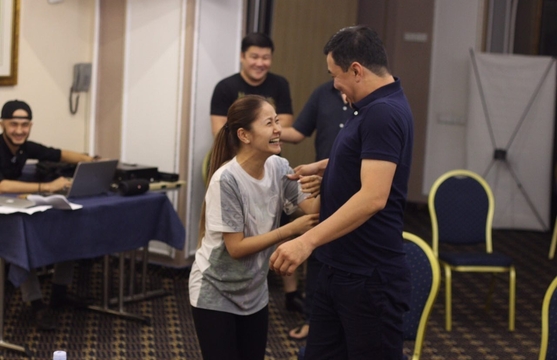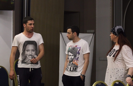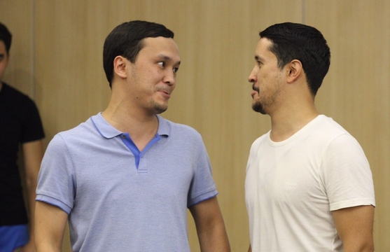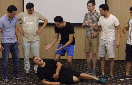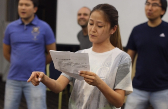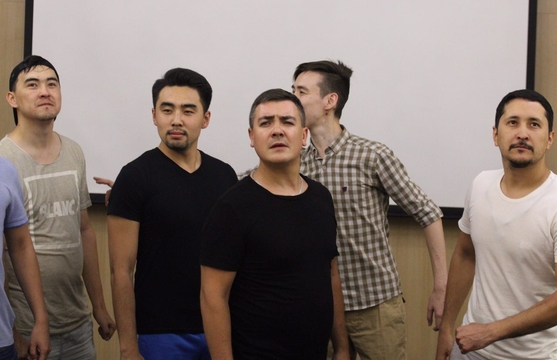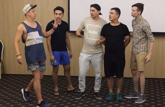 21.47 МДЗ – пока просто номера, без обвяза. Номер первый: История одного свидания – две разные версии (от мужчины и женщины). Второй: песня национальной героини – женщины, которая осмелилась поднять на мужа глаза, а теперь поет про матриархат, мужской гарем и сладкую возможность встать на минуту позже рассвета. Третий – песня необычного казаха Ярослава, который в душе Турсынбек. Ну и, видимо, какой-то финальный номер – разговор с Назарбаевым.