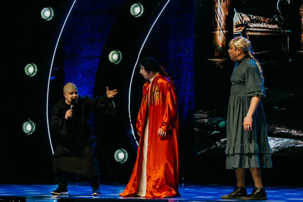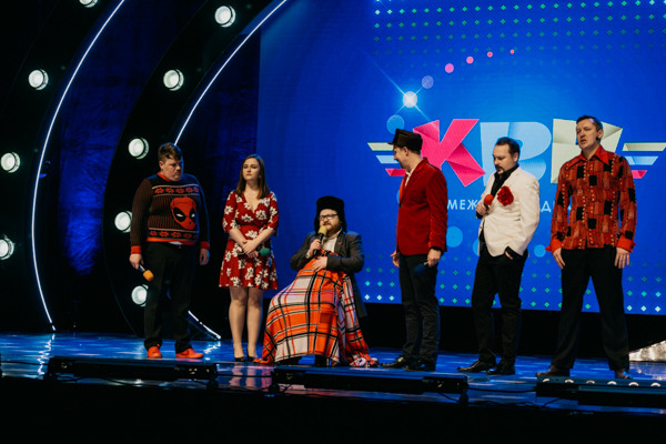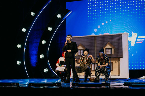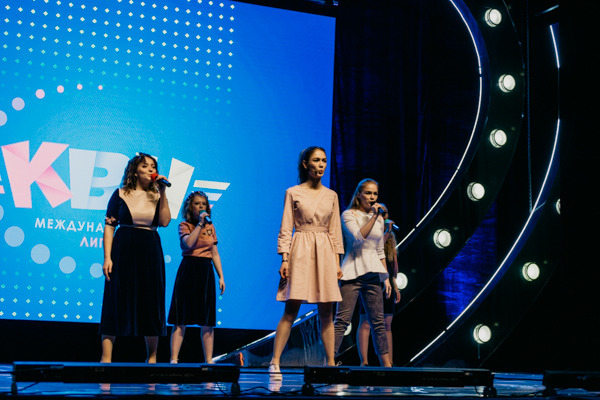 На сцене со своим приветствием единственная женская команда финала "Я обиделась".