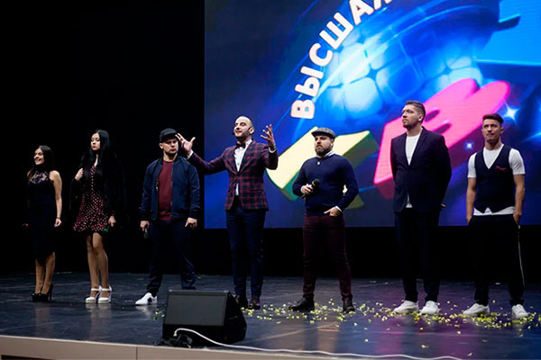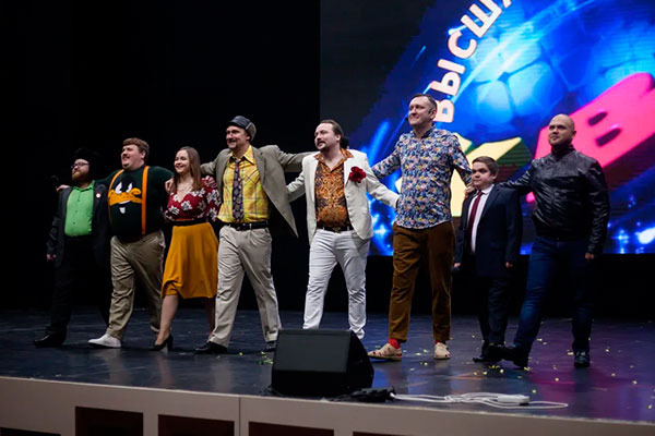 За столиками редакторов Александр Васильевич Масляков, Евгений Донских, Михаил Марфин. Где-то в закулисье Михаил Ярченко. На сцене команды первой 1/8 финала Высшей лиги КВН: