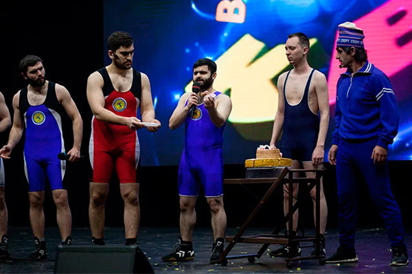 А вот и тренер борцов, который сделал их чемпионами по борьбе, а значит и чемпионами КВН сделает. И его играет дагестанский актер, который уже второй раз возвращается в КВН. Вот такая загадка.