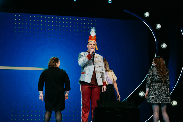 На сцене режиссер-постановщик Эдуард Шалютин. Объясняет залу, как себя вести на съемках телевизионного КВН, проверяет группы поддержки команд КВН.