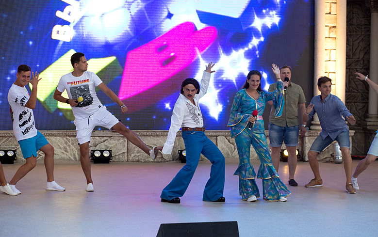 Номер про летние кафе в Ялте, в которых поют. За вокал отвечают Света с Айдаром. За смехи - Костя, который отыгрывает человечка в погонах, заказывающего песню.