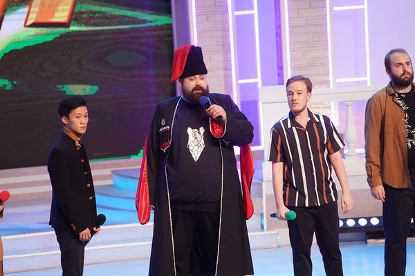 Рома в костюме кубанского казака и с подходом к жюри: Выбирает, с кем из членов жюри у Ромы может случится курортный роман.