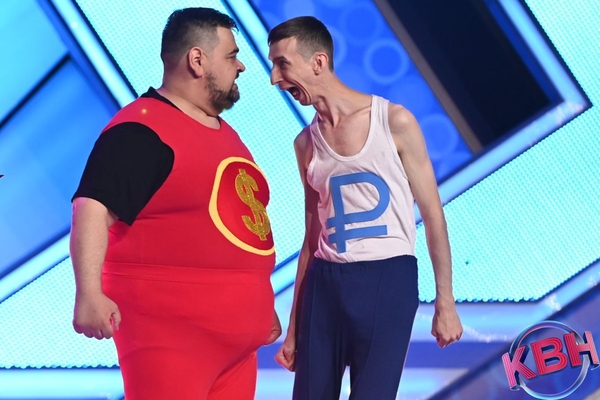 Большой номер на актуальную тему: на ринге борются доллар (Алан) и рубль (Витя), по прозвищу «Нероняемый»: разнообразные гэги на тему курса валюты, санкций, барреля нефти и прочее.