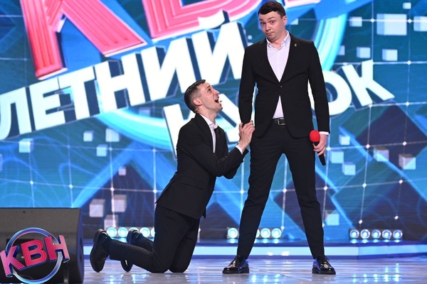 Егор из Сборной Перми берет в руки эту коробочку и опускается на колено, но не перед Аллой, а перед на Юлей из команды. Да-да, на сцене настоящее предложение. Зал в восторге!)