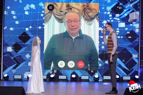 На сцене Антон Сасин в своем классическом образе Дмитрия Медведева - вот мы и выяснили, кто во время прямой линий выводил вопросы на экран :)