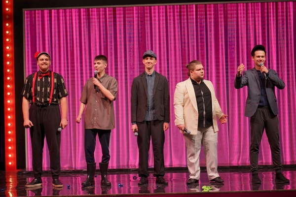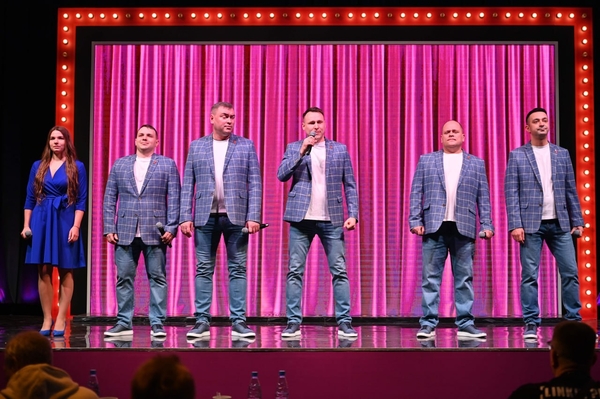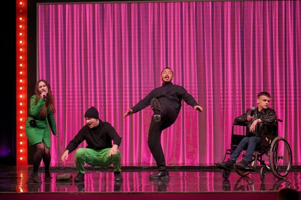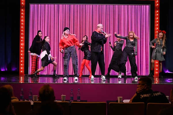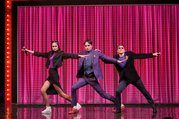 Да, у ребят свой маскот на сцене. И еще есть яркий выходящий персонаж Паша в розовом костюме.