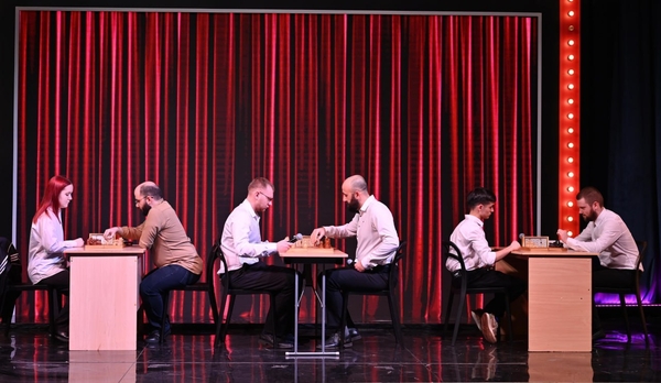 На сцене шахматные столы и 6 человек играют в шахматы. И говорят текст.