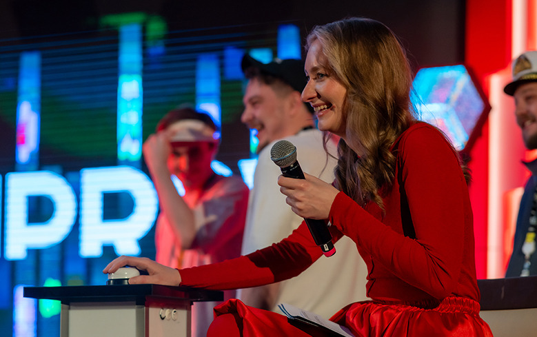 Женя активно взаимодействовала с залом, позволяя зрителям предлагать темы для дальнейших баттлов.