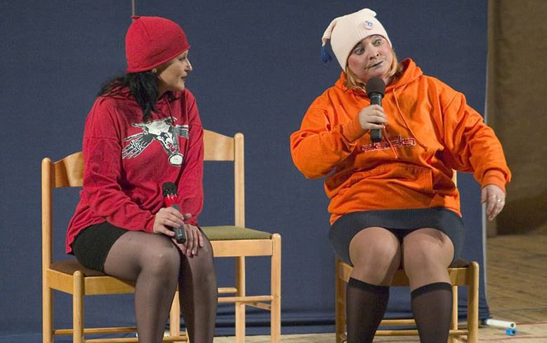 Наш дуэт сложился еще в Пермском ТЮЗе в 1999 году. Так, образами девочек, которые ходят смотреть спектакли в наш театр, мы решили поздравить наших мальчиков. Сначала Светка и Жанка были фанатками актеров - пэтэушницами они стали уже в КВН.