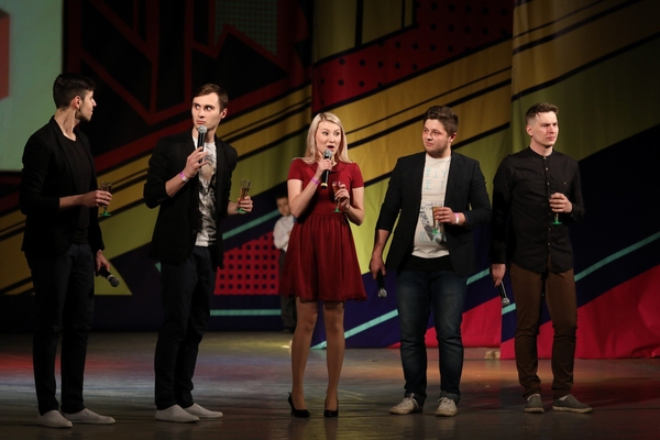 Девушки из «Арривы» выходят на сцену в шикарных вечерни платьях и с бокалами шампанским.