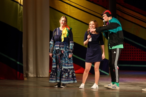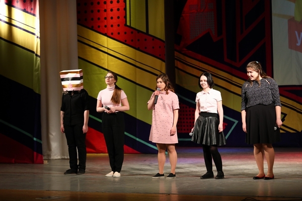 На сцене женская команда. Начинают со знакомства. Голова одной из девушек - Маши - в подарочном пакете (челябинцы эту команду уже знают,