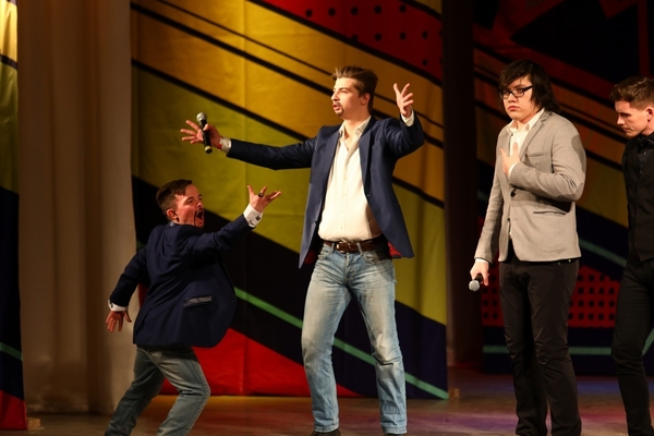 Начинают с объявления команды в стиле документального фильма. Очень тепло ребят встречает зал. Ребята уже приезжали к нам в позапрошлом сезоне.