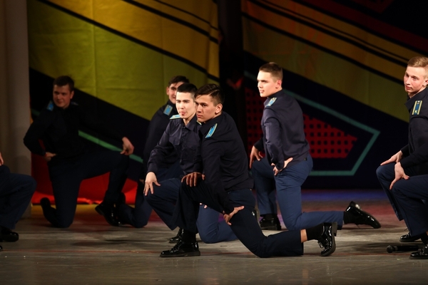 На сцене военная команда, перед нами лётчики челябинского военного училища. Начинают с поздравления девушек – мы холостые. Показывают,
