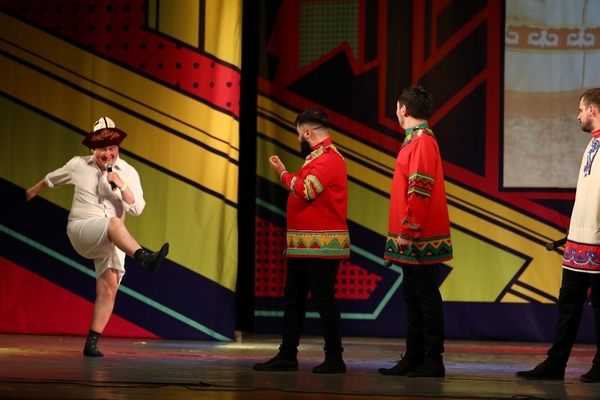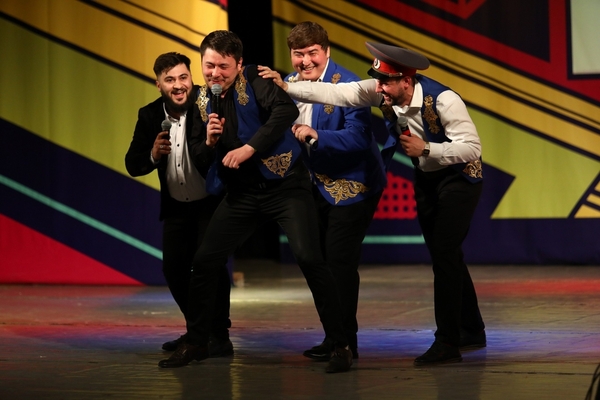 На сцене казахи из Сибири. Знакомятся со зрителем, рассказывают кто чем занимается - средне. Шутят про Крида и Блэк Стар.