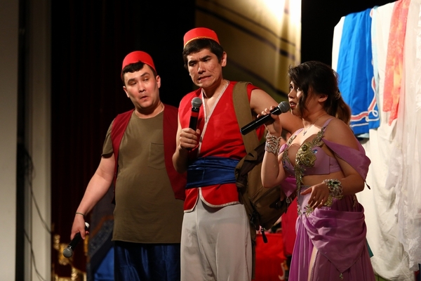 Декорации восточного рынка, песня с танцами живота, очень атмосферно и красиво! Раушан играет Алладина, Алибек ну