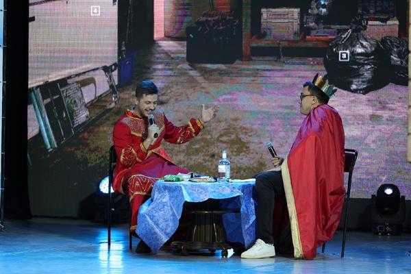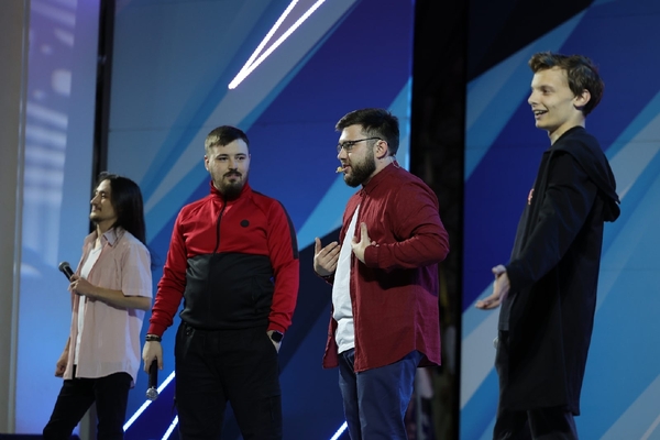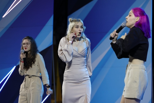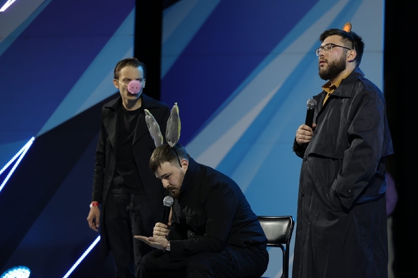 На сцене ведущий - Александр Шутов и первая четвёрка полуфиналистов. Они представят свои выступления в двух конкурсах: «Приветствие» и «Музыкальный фристайл».