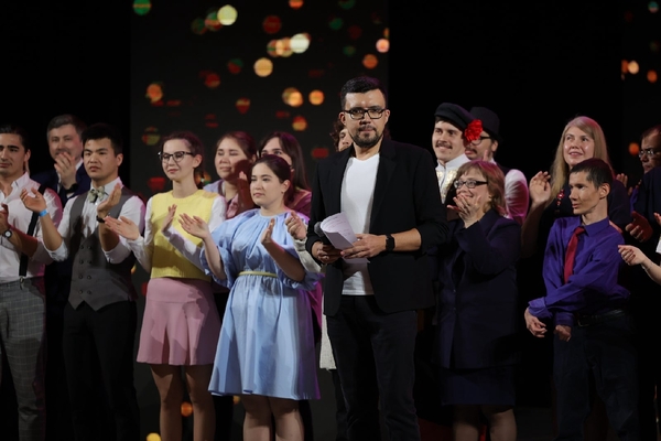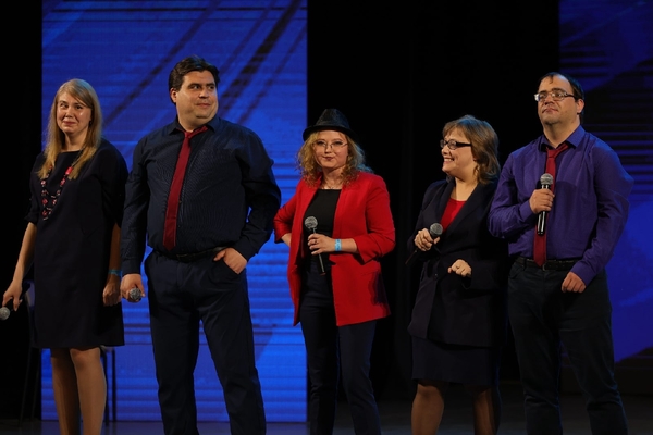 На сцене команда Всероссийского общества слепых, а значит надо быть готовыми к острым шуткам.