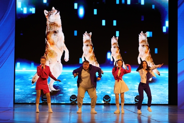 Выходят под видео с поющими и танцующими волками.